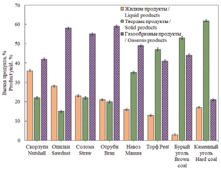Одной из актуальных задач научного сообщества является поиск и обоснование технологий, позволяющих снизить вредные выбросы при энергетическом использовании как традиционного твердого ископаемого сырья, так и биоресурсов. Термическая переработка рассматривается как один из наиболее эффективных подходов для достижения этой цели. Обширным количеством преимуществ, среди которых хорошая управляемость, масштабируемость и замкнутый цикл процесса, обладает пиролиз [8]. Методом пиролитической переработки могут быть утилизированы различные виды органического сырья [9–11] с получением ценных твердых, жидких и газообразных продуктов [12–14]. Дополнительным преимуществом при этом является тот факт, что твердые продукты пиролиза используются для секвестрации углерода, что способствует смягчению последствий изменения климата [15–17]. Таким образом, внедрение технологии пиролиза для переработки сырья позволит снизить удельные выбросы при транспортировке и использовании получаемых продуктов.