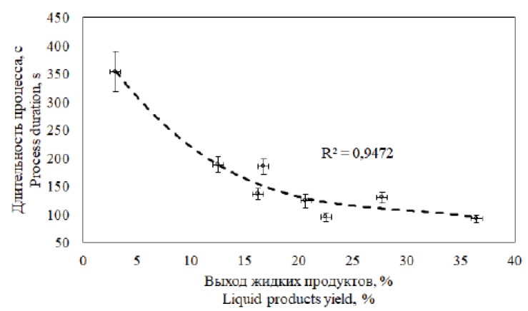 Электрофизические характеристики органического сырья изменяются в процессе пиролиза, как вследствие повышения температуры, так и по причине изменения его органического состава: переход части элементов органической составляющей топлива в жидкие и газообразные продукты. При анализе полученных данных (рис. 3, табл. 2) построена зависимость (рис. 4), связывающая длительность СВЧ-пиролиза органического сырья и величину выхода жидких продуктов в процессе его протекания. Видно (рис. 4), что с увеличением выхода жидких продуктов снижается длительность протекания СВЧ-пиролиза сырья. Согласно литературным источникам [34, 35] в составе смолопродуктов присутствует обилие химических соединений углеводородных групп, которые в результате термической деструкции могут частично или полностью переходить в твердый углерод [36–38] и иные соединения, обладающие высоким, относительно исходного сырья, значением тангенса угла диэлектрических потерь. В работах [39, 40] авторами представлены результаты разложения органических соединений в газовых и жидких средах в плазме СВЧ-разряда, которые показывают наличие аморфного углерода и углеродных нанотрубок в числе получаемых продуктов. В дополнение к этому в работе [41] показано, что при взаимодействии органических веществ с СВЧ-плазмой преимущественно наблюдаются окислительно-восстановительные реакции, в результате которых происходит разрушение сложных органических соединений с образованием новых, более простых соединений.