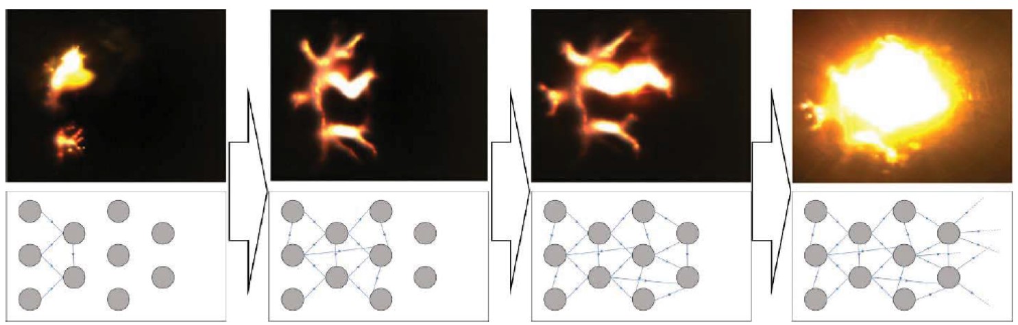 В работе [42] авторами показано, что электропроводные свойства углерода могут меняться в широком диапазоне. К тому же некоторые углеродные структуры могут обладать свойствами металлов [43]. Как описано в работе [44], при наличии центров с металлическими или полупроводниковыми свойствами в сырье, находящемся в СВЧ-поле, могут возникать межчастичные электрические разряды, распространяющиеся вдоль образца (рис. 5).
