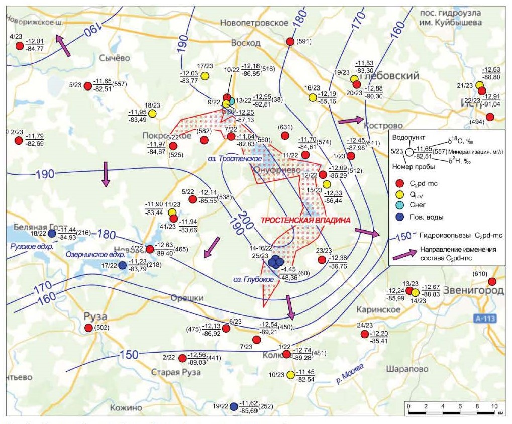 К Тростенской впадине приурочены подземные воды, характеризующиеся более тяжелым изотопным составом (δ18O, δ2Н, δ17O). Так, значение δ18O составило от –11,64 до –11,70 ‰, δ2Н –82,83 ‰ и δ17O – от –6,13 до –6,14 ‰. Облегчение изотопного состава происходит в соответствии с направлением движения подземных вод (на юг к р. Москве и на восток, юго-восток к г. Истре, г. Москве). Вероятно, облегчение изотопного состава на периферии связано с прохладным климатом ледникового периода московского возраста. В центральной и северо-западной части в постледниковый период происходит поступление подземных вод с более тяжелым изотопным составом. Наибольшая разница в изотопном составе подземных вод между подольско-мячковским и четверичным водоносным комплексом отмечается в периферийной части области исследования и составляет 0,28 ‰, а близкий состав – в районе развития Тростенской впадины и северо-западнее нее (0,02–0,04 ‰).