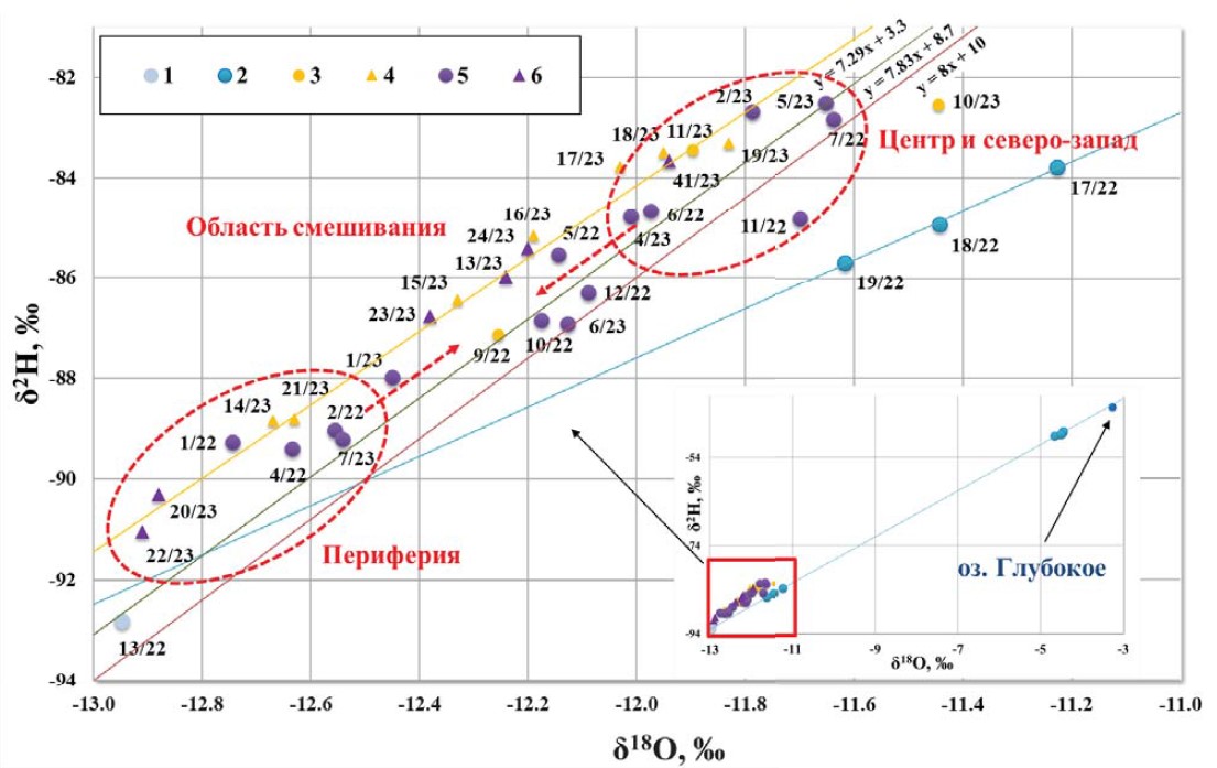 Fig. 2. Graph of the dependence of δ²H on δ¹⁸O in the natural waters of the study area [14]: 1 – snow; 2 – surface waters; 3 – quaternary aquifer tested in March 2022 and 2023; 4 – quaternary aquifer tested in June 2023; 5 – Podolsk-Myachkovsky aquifer tested in March 2022 and 2023; 6 – Podolsk-Myachkovsky aquifer complex tested in June 2023
