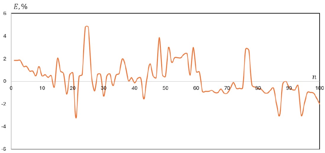 В табл. 4 приведены фактические и прогнозные значения расхода электроэнергии в процессах плавок стали для всех 100 точек прогнозирования. Применен шаг в 5 единиц, а ошибки прогнозирования определены по 100 точкам прогнозирования.