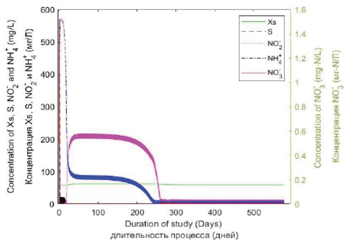 Рис. 2. Концентрации NO₃⁻, NO₂⁻, NH₄⁺, биоразлагаемых органических веществ (S) и медленно биоразлагаемого субстрата (Xs) в сточных водах в реакторе непрерывного действия (РНД)
