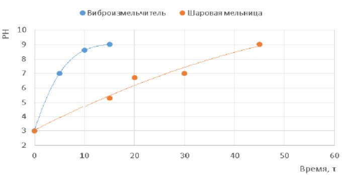 Предварительными опытами было установлено влияние интенсивности нейтрализации и измельчения фторангидрита и извести в лабораторной шаровой мельнице и вертикальном шаровом виброизмельчителе на время нейтрализации фторангидрита (рис. 2).