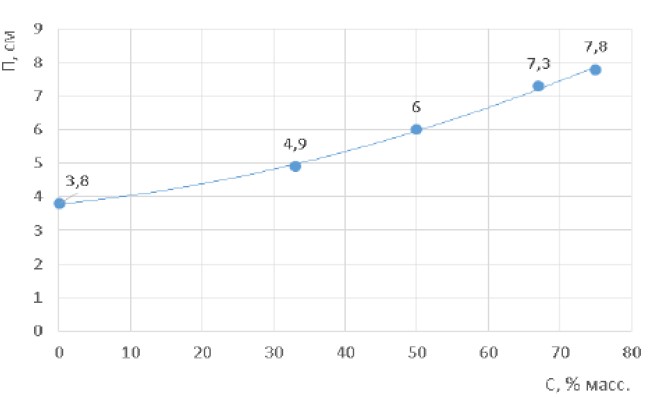 Рис. 3. Влияние соотношения воды и отсева гравия (С, %) на подвижность (П) раствора