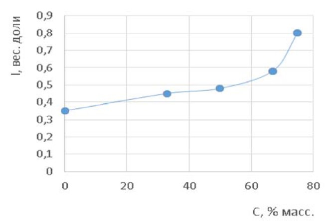 Рис. 4. Влияние соотношения воды и отсева гравия (С, %) на водопотребность (I, вес. ч.)