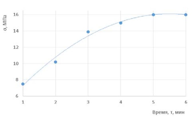 Таким образом, можно констатировать положительную динамику возрастания прочности изделий при увеличении времени перемешивания, которая выравнивается после 5 минут процесса.