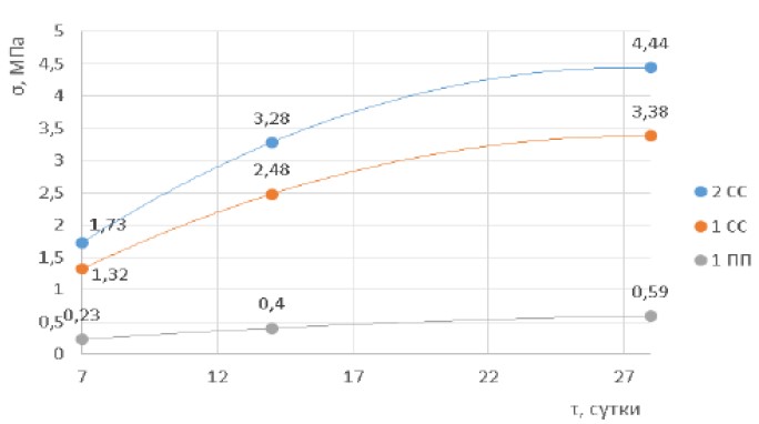 Предел прочности образцов на сжатия, МПа Compressive strength of samples, MPa | 7,5 | 8,4 | 10,2 | 12,0 | 13,9 | 15,0 | 16,0 | 16,0 |
