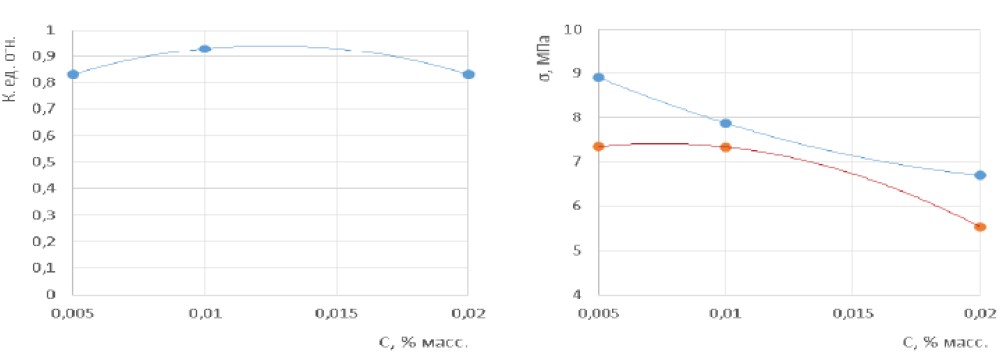 Fig. 9. Sulfonol concentration (C) effect on water resistance (K, r.m.s.) and on strength (σ, MPa) of anhydrite specimens