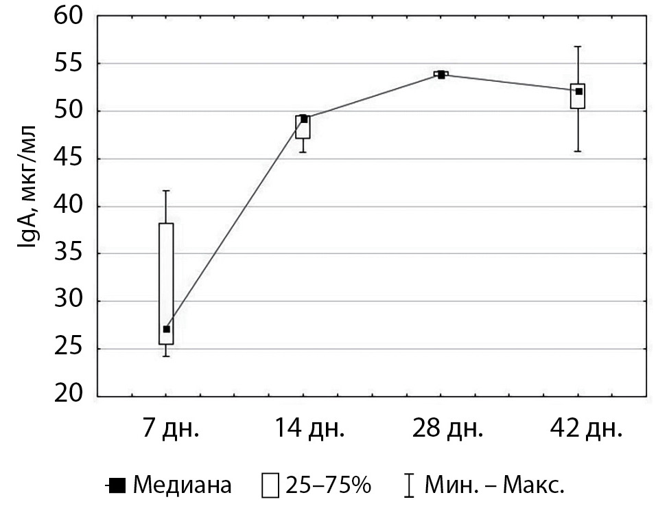 При рассмотрении содержания в сыворотке в крови IgA, установлено, что его уровень постепенно увеличивался в ходе онтогенеза цыплят, но начиная с 28 суток физиологического развития снижался (рис. 7).