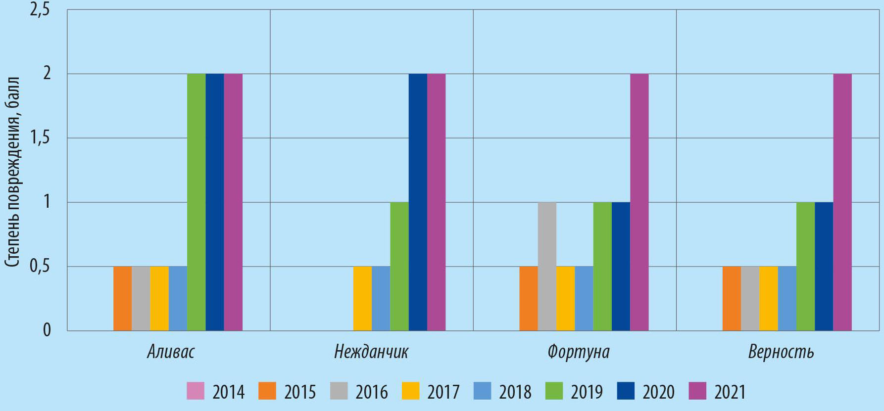 У остальных сортов (8,3%) из этой группы (Аливас, Фортуна, Верность) признаки повреждения отмечены на четвертый, максимальная степень (2 балла) – седьмой-девятый год.