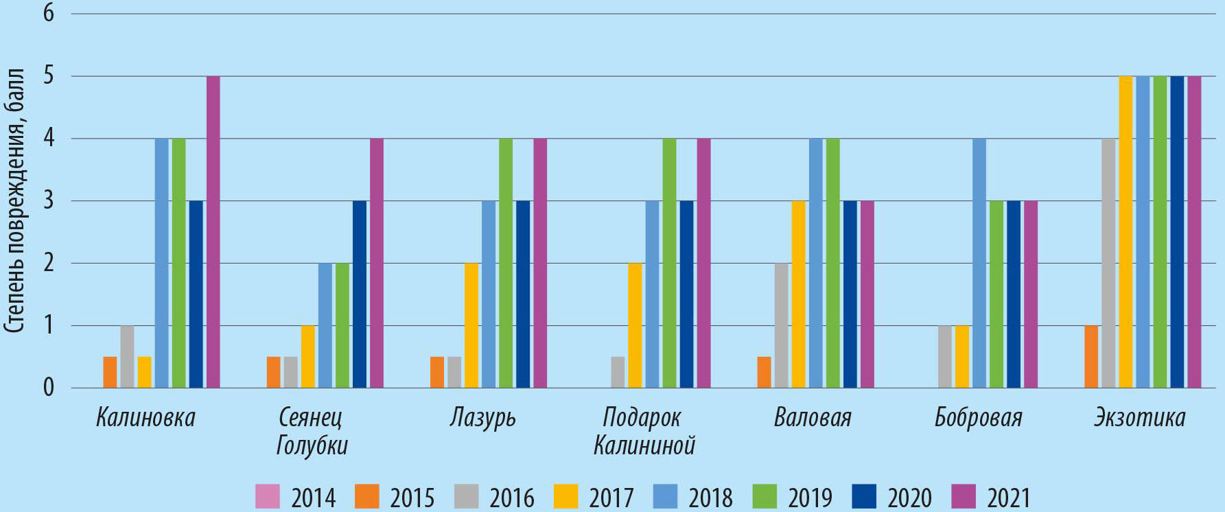 В группе слабоустойчивых сортообразцов с максимальной степенью повреждения 3,0 балла первые признаки выявлены уже на второй год после посадки у сорта Кушнарёнковская, третий – Виноградная, Аркадия, Зеленая дымка, Наследница, Тарзан (13,9%), четвертый (2016) – Дачница. У данных сортов (кроме Зеленой дымки) сохранялся невысокий уровень повреждения (0,5…1,0 балла) до 2019–2020 года (рис. 2, 4-я стр. обл.).