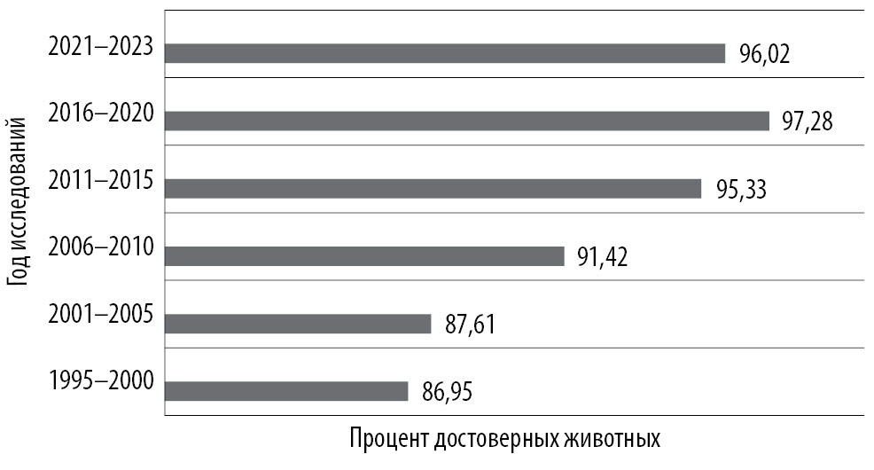 Процент достоверности происхождения племенных животных варьирует от 86,95 (1995–2000 годы) до 97,28% (2016–2020). Результаты указывают на высокую культуру ведения зоотехнической работы в селекционируемых стадах (рис. 2).