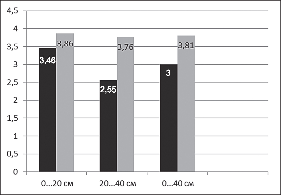 Наибольшее содержание органического вещества отмечено на интенсивном (И) фоне. В этом варианте в СЛ ВГГ в слое 0…40 см оно достигало 4,86 % (рис. 6), в СЛ – 3,48 %. Полученные результаты согласуются с данными других исследователей серых лесных почв Владимирского Ополья [12].