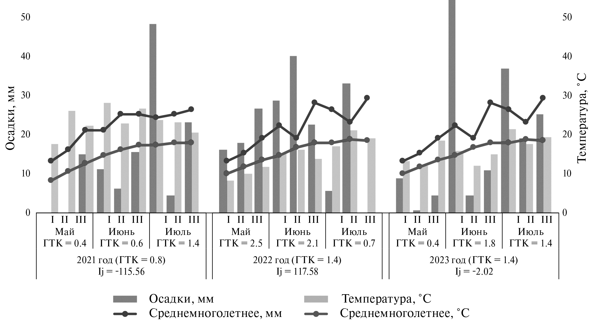 Погодные условия за период изучения коллекции гороха варьировали от засушливых (2021, 2023 гг.) до оптимальных (2022 г.). В 2021 г. отмечали критическую недостачу влаги, ГТК варьировал от 0,4 до 1,4 (рис. 1), что негативно отразилось на общей продуктивности гороха (Ij = –115,56). В 2022 г. начало вегетации характеризовалось избытком влаги и теплой погодой в период цветение–созревание, что вызвало увеличение продолжительности периода вегетации, но позволило растениям сформировать хороший урожай (Ij = +117,58). В 2023 г. в начале вегетации гороха наблюдали засуху, осадки выпали в период цветение–созревание и растения смогли сформировать урожай (Ij = –2,02).