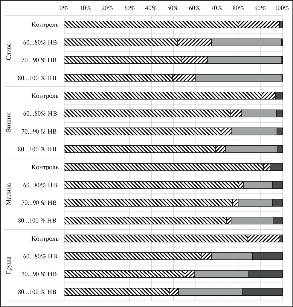 Структура суммарного водопотребления саженцев плодовых и ягодных культур в зависимости от влажности корнеобитаемого слоя почвы: ▧ – приход влаги; ▨ – использование почвенной влаги; 🔲 – оросительная норма; 🔳 – подпитывание грунтовыми водами.
