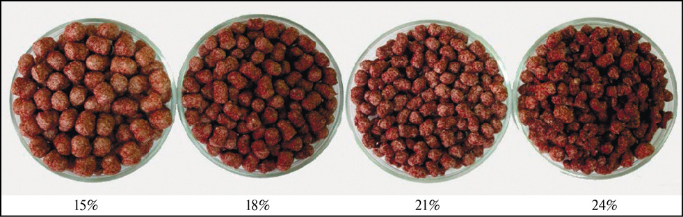 При экструдировании сырья с влагосодержанием 24 % резка стренгов усложнялась, происходило слипание экструдата, отмечено ухудшение формования (рис. 1).
