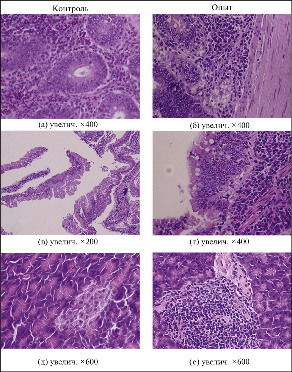 Рис. 1. Гистологическая структура органов (двенадцатиперстная кишка, поджелудочная железа) кур-несушек. Окраска гематоксилином и эозином (фото Дроздовой Л. И.): a – псевдоэозинофилия в межуточной ткани железистого аппарата двенадцатиперстной кишки; б – гиперсекреция слизи, слизистый катаральный дуоденит; в – катарально-некротический дуоденит, некроз и десквамация пластов эпителия ворсинок; г – выпотевание слизистого экссудата в просвет двенадцатиперстной кишки; д – островок Лангерганса поджелудочной железы, снижение секреции; е – гиперсекреция и гиперплазия островков Лангерганса.