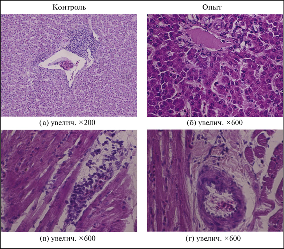 Рис. 2. Гистологическая структура органов (печень, сердечная мышца) кур-несушек, окраска гематоксилином и эозином (фото Дроздовой Л. И.): a – полиморфноклеточная периваскулярная инфильтрация в системе триады на фоне зернистой дистрофии гепатоцитов; б – зернистая дистрофия гепатоцитов, отек межуточной ткани в системе триады; в – признаки миокардита в сердечной мышце; г – периваскулярный отек и пролиферация элементов сосудистой стенки, зернистая дистрофия кардиомиоцитов.