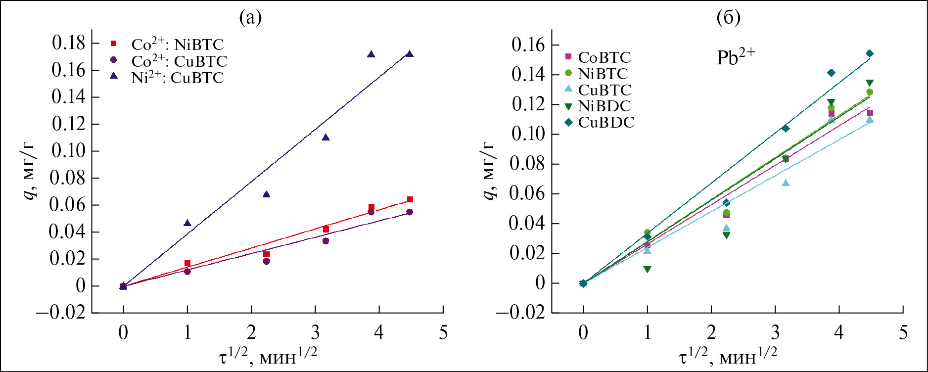 Поглощение ионов кобальта сорбентами NiBTC и CuBTC, ионов никеля соединением CuBTC, а также ионов свинца на всех исследуемых материалах подчиняется диффузионной модели Вебера – Морриса [16] (рис. 6) согласно уравнению (5):