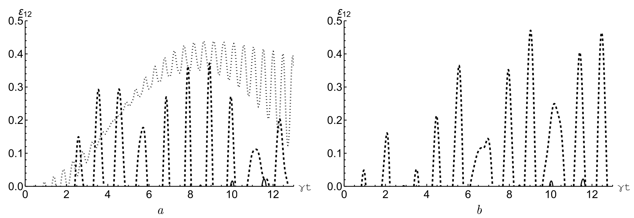 Результаты компьютерного моделирования временной зависимости отрицательности для кубитов 1 и 2 от приведенного времени для начального сепарабельного состояния кубитов , и различных значений параметра расстройки и керровской нелинейности представлены на рис. 2.1. Начальное число фотонов в моде выбрано равным . Из рисунка хорошо видно, что учет расстройки и керровской нелинейности приводит к существенному увеличению максимальной степени перепутывания кубитов 1 и 2. Заметим также, что в отличие от случая теплового поля резонатора [67] для фоковского начального состояния поля для кубитов 1 и 2 отсутствует эффект мгновенной смерти перепутывания.