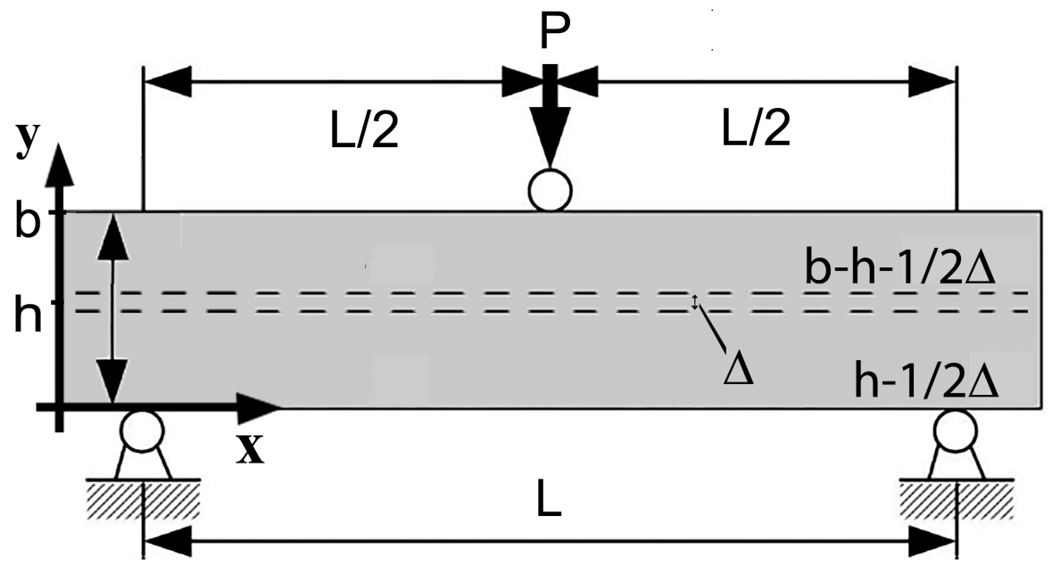 Рассмотрим балку прямоугольного поперечного сечения из двух слоев различной толщины из упругих однородных материалов в условиях трехточечного нагружения. Нижний слой, противоположный стороне приложения нагрузки обозначим индексом , а верхний слой индексом . Толщина слоев и их пропорции могут быть различными, но сумма толщин равна фиксированной величине толщины балки .