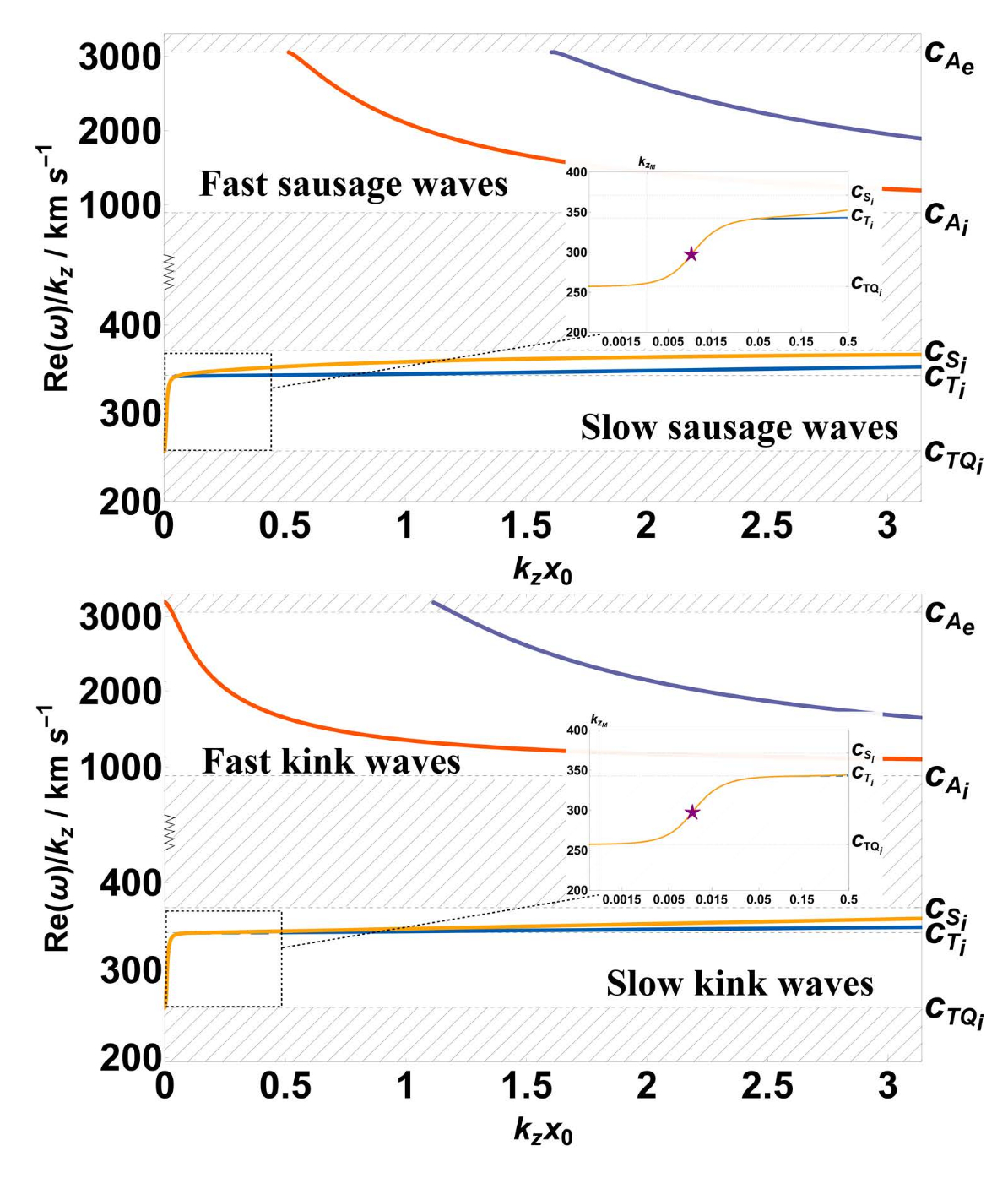 The parameterization of the radiative cooling function has been calculated using the CHIANTI Version 10.0 database [9]. The heating rate has been modeled as . Such heating scenario has been seismologically proposed by [10] using the observations of the damped slow magnetoacoustic waves in the long-lived coronal plasma structures. The dispersion curves for body fast/slow sausage/kink magnetoacoustic waves are shown in Figures 1, 2.