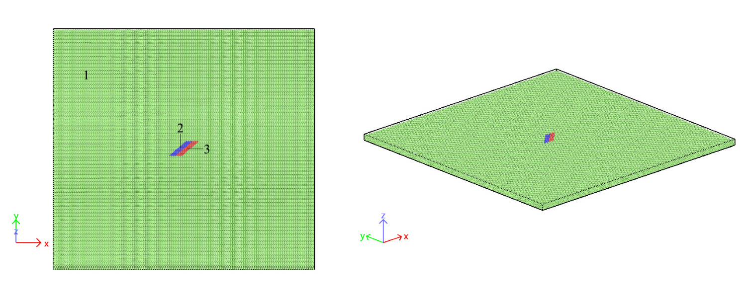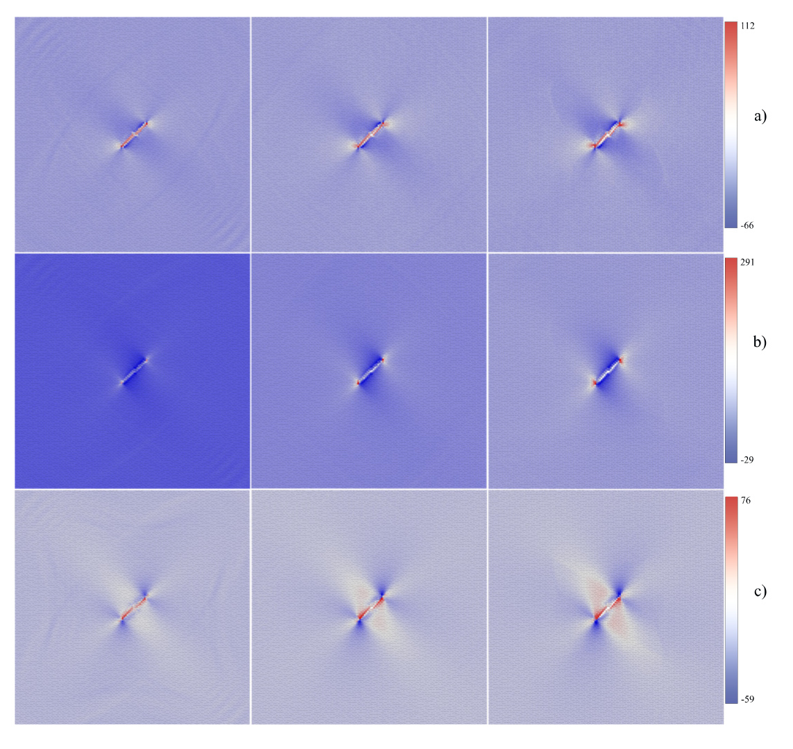 Для исследования полей напряжений в окрестности вершины трещины на наноразмерном уровне был написан скрипт для LAMMPS. В рамках поставленной задачи построения пластинки с центральным дефектом на наноскопическом уровне удобно оперировать с размерностями Å для длины, пс для времени и бар для напряжения, поэтому применялась команда units metal. Несмотря на то что исследумый объект — пластинка, все же она будет обладать некоторой толщиной в несколько атомов, поэтому в коде прописывалась размерность пространства dimension 3. Задавались периодические граничные условия во всех направлениях boundary p p p. Определение стиля представления частиц atom style atomic означает, что будет рассматриваться простейший случай, когда каждая частица в системе считается точечной без внутренней структуры или ориентации. Задание решетки (в данном случае гранецентрированная кубическая решетка с параметром решетки 3.615 Å) определяется командой lattice fcc 3.615. Создание бокса для размещения атомов размерами 1201203 в единицах параметра решетки region box prism 0 120 0 120 0 3 0 0 0 (часто бывает удобрым моделировать именно призму, поскольку в случаях, когда к пластине прикладывается сдвиговая нагрузка, происходит наклон ее боковых границ, в таких ситуациях region box block выдает ошибку). В результате было смоделировано 172 800 атомов. Для создания области с 3 типами атомов в указанном регионе используется команда create box 3 box. Команда create atoms 1 region box создает атомы типа 1 внутри региона box. Для создания трещины длины 10 (в единицах параметра решетки) определялось два региона, представляющих верхнюю и нижнюю области, где были определены атомы типов 2 и 3. На рис. 1.1 атомы первого типа обозначены цифрой 1, второго — цифрой 2, третьего — 3. Регионы выделялись из соображений, чтобы трещина располагалась под углом 45 градусов как к осям симметрии рассматриваемого материала с ГЦК-решеткой, так и по отношению к прикладываемой далее нормальной нагрузке. Потенциал взаимодействия между атомами устанавливался командой pair style eam, где eam — embedded atom method, то есть использовался потенциал внедренного атома. Командой pair coeff * * Cu u3.eam задавались коэфициенты потенциала, определенные в файле Cu u3.eam. Чтобы исключить взаимное влияние друг на друга атомов типа 2 и 3, использовалась команда neigh modify exclude type 2 3. Напряжения на атом рассчитывались командой compute peratom all stress/atom. Для моделирования прикладываемой нормальной нагрузки в 80 ГПа использовалась команда fix npt, температура поддерживалась равной 10 К для уменьшения влияния пластических деформаций. Командой dump формировался файл, позволяющий получить данные временной эволюции полей напряжений, воспринимаемые пакетами для визуализации. Кадры, иллюстрирущие реакцию пластинки на растяжение для компонент тензора напряжений , , на временных шагах 4 пс, 7 пс, 9 пс, полученные в пакете OVITO, представлены на рис. 1.2.