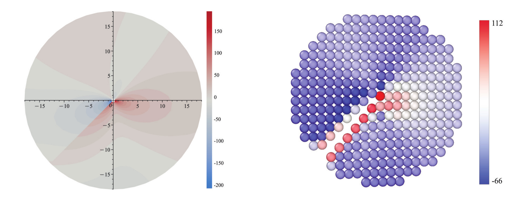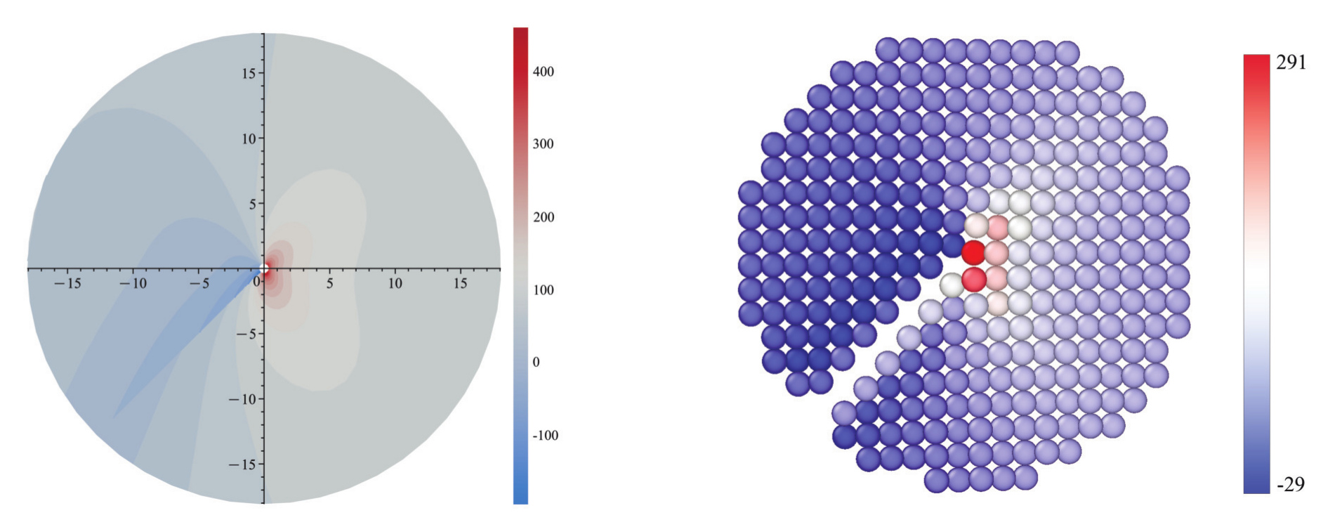 Рис. 3.1. Контурный график, построенный согласно аналитическому решению (слева), и распределение полей напряжений, полученное путем МД-моделирования (справа), для компоненты тензона напряжений