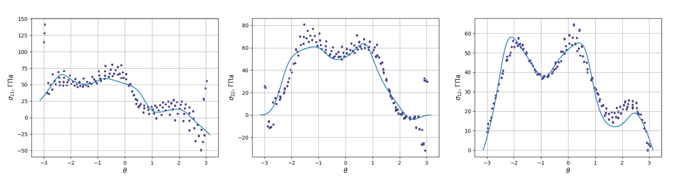Рис. 3.4. Угловые распределения для компонент тензора напряжений , и , где линия — результат аналитического решения, точки — данные, полученные МД-методом
