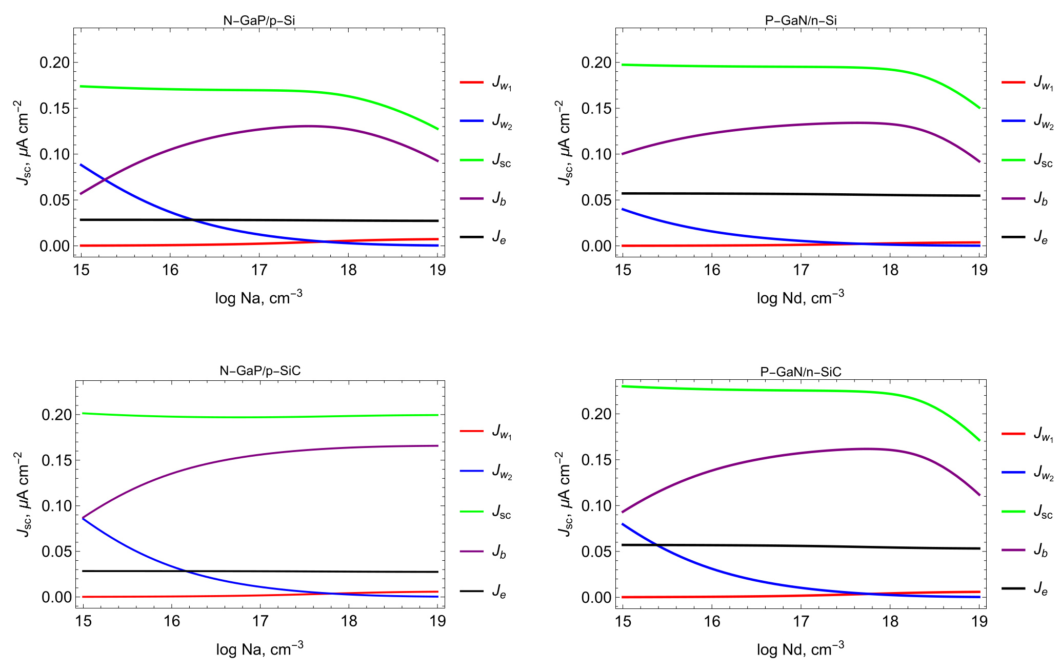 На рис. 1.2 представлены плотности токов короткого замыкания и их составляющие компоненты в полупроводниковых материалах. Получены при легировании тонкого первого слоя до и ширине мкм. При уменьшении концентрации легирования слоя эмиттера ток возрастает на 10–20 %.