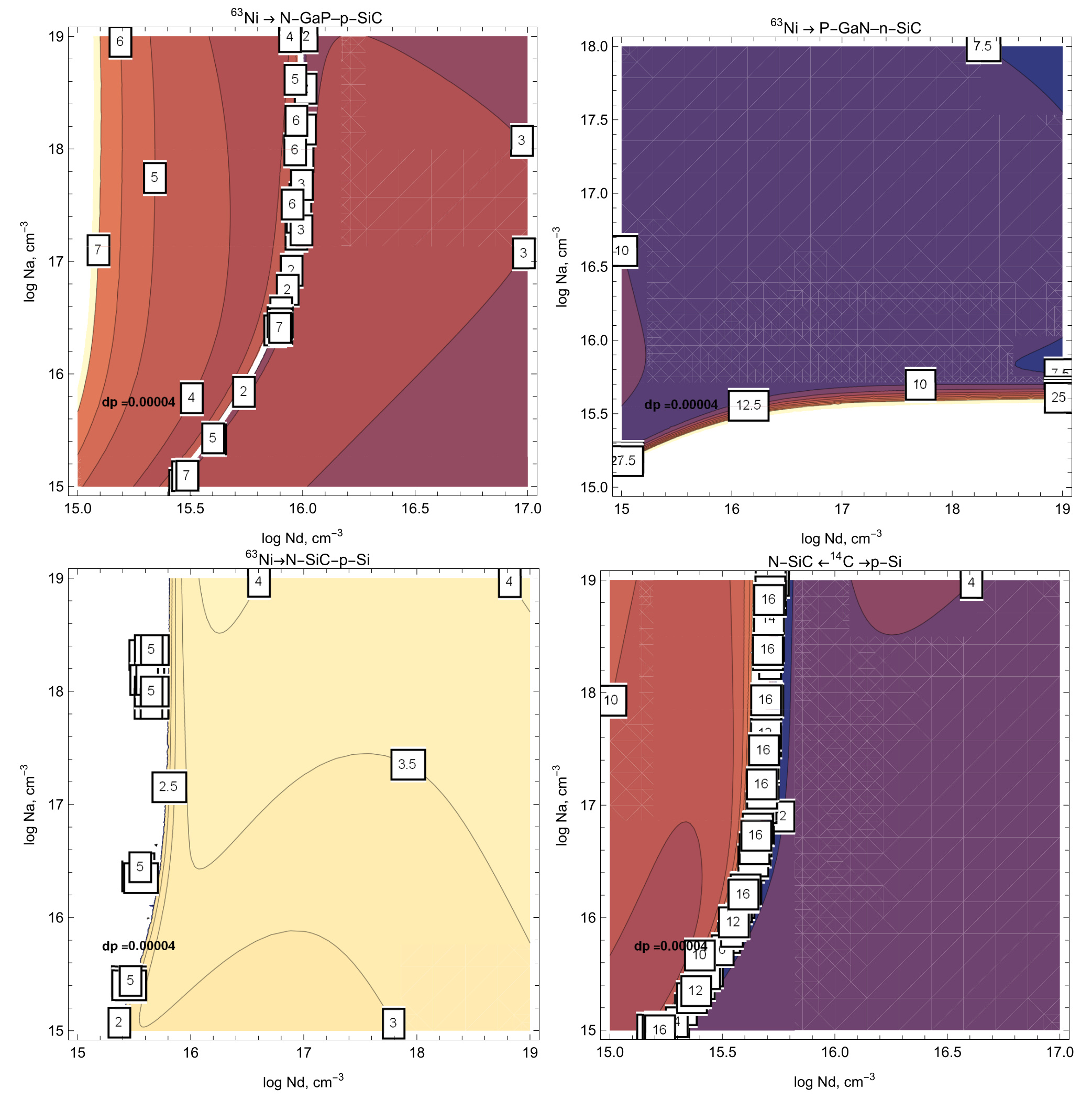 В этой статье гетеропереходные p–n диоды GaN–Si и GaP–Si используются для повышения КПД в батарее с прямым преобразованием вместо одиночного p–n гомоперехода. Рассчитываются значения КПД и выводится теоретическая модель оптимизации для сравнения электрических характеристик с материалами гетеропереходов GaN и GaP на подложках Si и 3С-SiC/Si [7; 8]. В данном исследовании радиоактивные источники Ni, C выбраны из-за подходящего периода полураспада и умеренной средней энергии распада. Что касается преобразователя энергии гетеропереходом, материал зазора выбран таким образом, чтобы образовывать гетеропереход с Si или 3С-SiC/Si [9; 10]. Для барьерных диодов Шоттки на основе Si и SiC [34], In, Al, Ti, Ag и W выбраны в качестве металлов Шоттки. Проведено моделирование для определения транспортных характеристик бета-частиц в материалах для преобразования энергии методом Монте-Карло. Наконец, в соответствии со сравнительными результатами, получены оптимизированные толщина и концентрации легирующих примесей полупроводниковых слоев для элементов бетавольтаической батареи. Определены теоретические расчеты максимальных электрических свойств таких батарей.