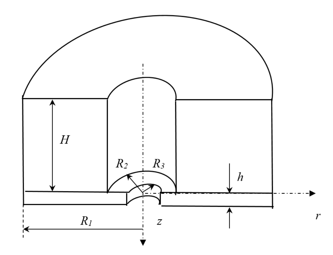 Рассмотрим слой толщины , сцепленный с массивным основанием, имеющим цилиндрическое отверстие радиуса , со стороны которого на слой прикладывается давление . Введем цилиндрическую систему координат с осью , расположенной по центру отверстия, и направленную в сторону, противоположную от прилегающего основания (рис. 1.1).