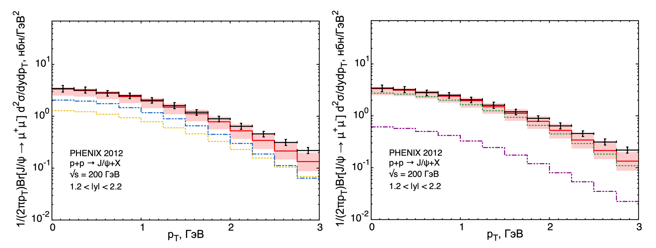 Рис. 3.2. Зависимость дифференциального сечения рождения от поперечного импульса чармония в сравнении с экспериментальными данными коллаборации PHENIX [27]. Слева показано сравнение полных синглетного (желтая пунктирная линия) и октетного (синяя штрихпунктирная с двумя точками) вкладов в рождение . Справа - сравнение прямого рождения (зеленая пунктирная) и вклада от распадов возбужденных состояний чармония (фиолетовая штрихпунктирная с двумя точками). Красная сплошная линия в обоих случаях отвечает суммарному сечению