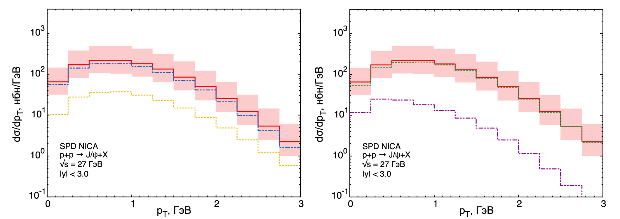 6. Fig. 3.5. Prediction for differential cross section of the prompt  production as a function of charmonium transverse momentum  at NICA energy  GeV. Comparison of the singlet (yellow dotted line) and octet (blue dash-dot-dotted line) contributions is shown on the left, comparison of the direct  production (green dotted line) and feed-down (purple dash-dot-dotted line) contributions is shown on the right. Red solid line refers to summed  production on both plots