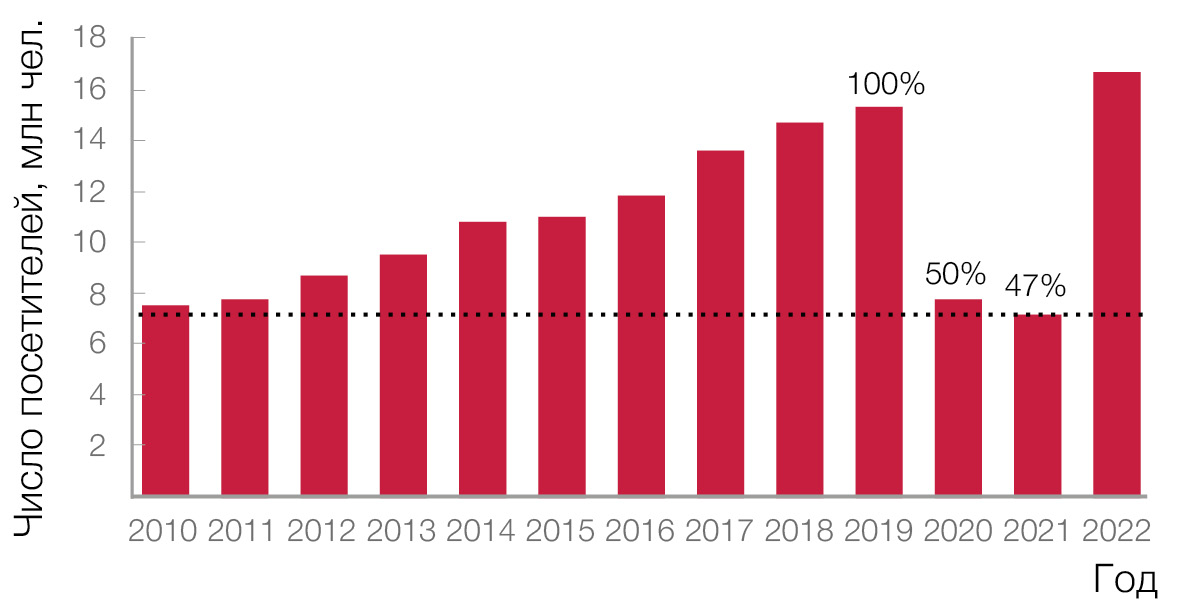По мнению некоторых экспертов, возвращение показателей посещаемости для всей музейной отрасли к уровню 2019 г. могло занять до трех лет. По предварительным итогам 2022 г., прогнозный показатель посещаемости в прошедшем году составляет около 16 млн человек. Эти данные вселяют уверенность, что в 2023 г. прирост посещаемости продолжится.