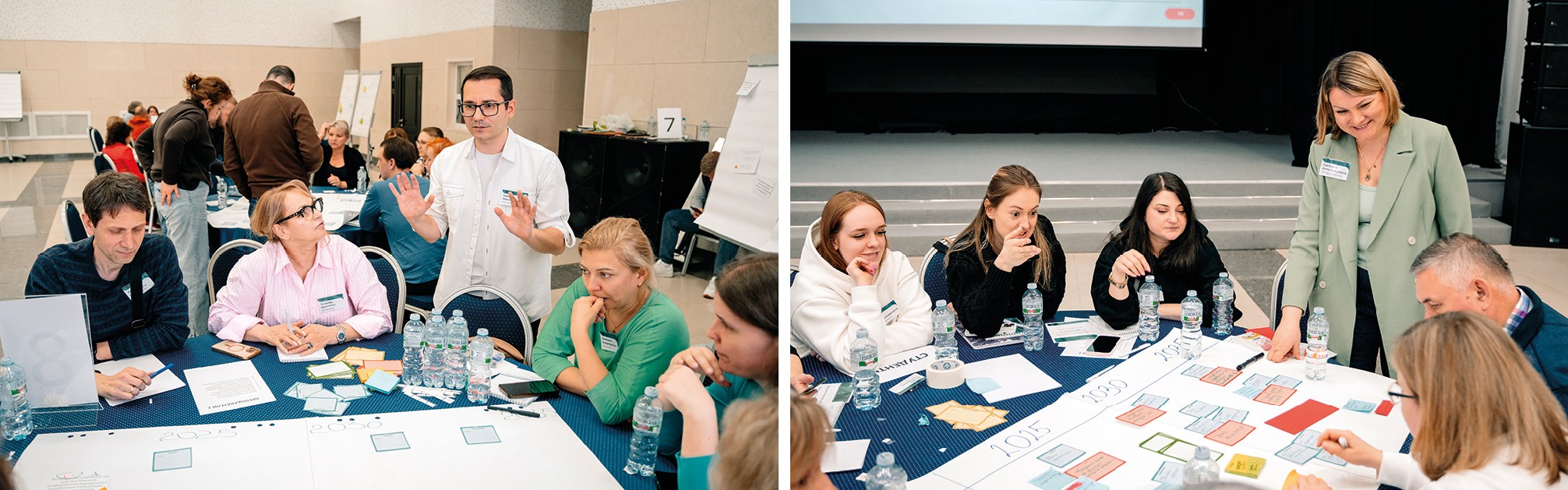 Выездной университет «PRO будущее», форсайт-сессия: коллектив Университета Правительства Москвы прорабатывает возможные пути развития вуза (фото А. Красавина, 2024 г.)