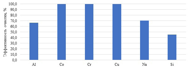 Кобальт, хром, медь, цинк полностью извлекаются из сточной воды через 3 ч сорбции независимо от изменения температуры. Магний можно максимально удалить на 72,2 % при температуре 0 °С через 3 ч контакта сточной воды с сорбентом. С повышением температуры и времени контакта происходит уменьшение эффективности сорбции катионов магния, что, по-видимому, связано с переходом в сточную воду магния из лузги. Очистка от натрия и кремния максимально эффективно проходила при 0 °С через 7 сут. Увеличение температуры приводит к их переходу в воду.