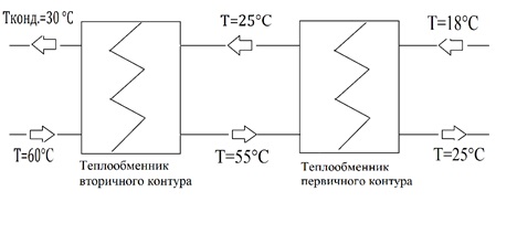 Одним из способов увеличения энергоэффективности СКВ чиллер-фанкойл является использование морской или речной воды для охлаждения конденсатора чиллера (охладителя жидкости), так как увеличение температуры конденсации приводит к повышенным затратам на сжатие хладагента вследствие повышения требуемого давления конденсации [6−10]. Температура конденсации зависит от температуры окружающей среды и, как правило, больше последней на 10-15 °С. То есть при воздушном охлаждении конденсатора чиллера при температуре окружающего воздуха 30-35 °С температура конденсации хладагента будет составлять не менее 45 °С.