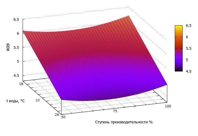 На основании уравнения регрессии и наглядного изображения поверхности отклика можно сделать заключение, что наибольшее влияние на коэффициент энергоэффективности СКВ – EER оказывает температура морской воды. Ступенчатое регулирование производительности компрессора позволяет сгладить неравномерное потребление «холода» в течение дня, в зависимости от пиковых значений температур наружного воздуха.
