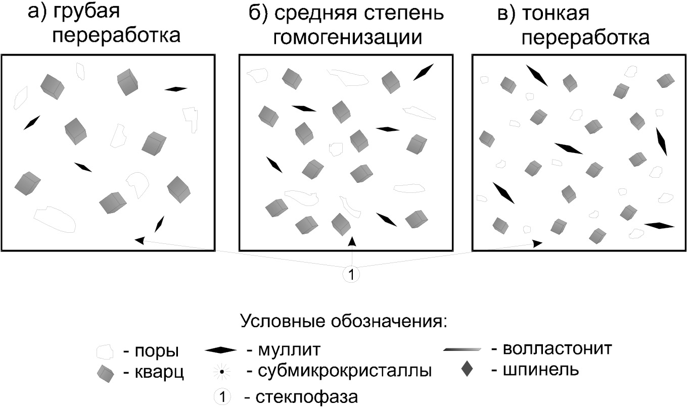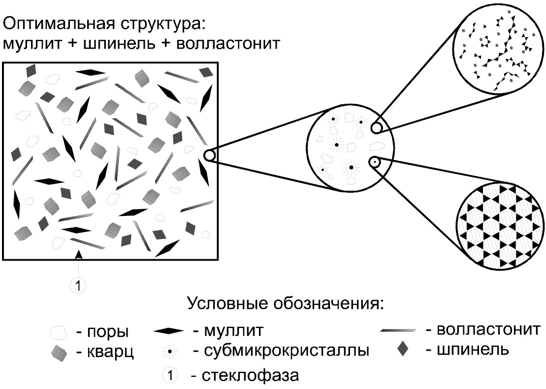 Повышение прочности может быть достигнуто на гомогенных шихтах за счет оптимизации структуры и фазового состава путем направленного синтеза кристаллических новообразований (муллита, шпинели, волластонита, а также твердых растворов) и каталитической кристаллизации эвтектического алюмосиликатного расплава [5].