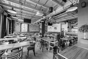 В интерьере сохранен оригинальный облик здания с внедрением минималистичной, однотонной мебели черного и белого цвета или же с текстурой дерева (рис. 4).