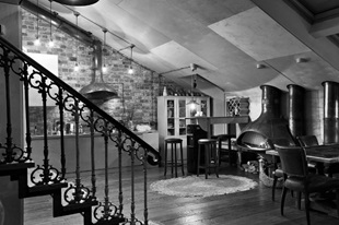 В интерьере сохраняется красный кирпич, бетонные полы и балки. Мебель больше похожа на историческую, нежели в предыдущих вариантах: стулья и табуреты, обитые бордовой или черной кожей, сочетание светлого дерева с темно-красным. Сохранены чугунные ажурные балясины и покрытые заклепками металлические трубы, переходящие в форму шара. Такое необычное сочетание создает ощущение, что вы находитесь в книге жанра научной фантастики (рис. 11).