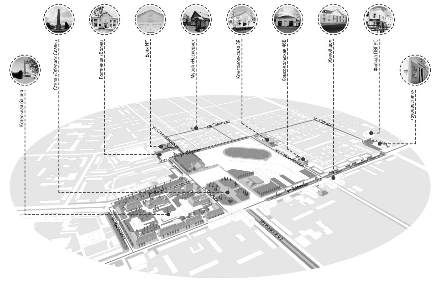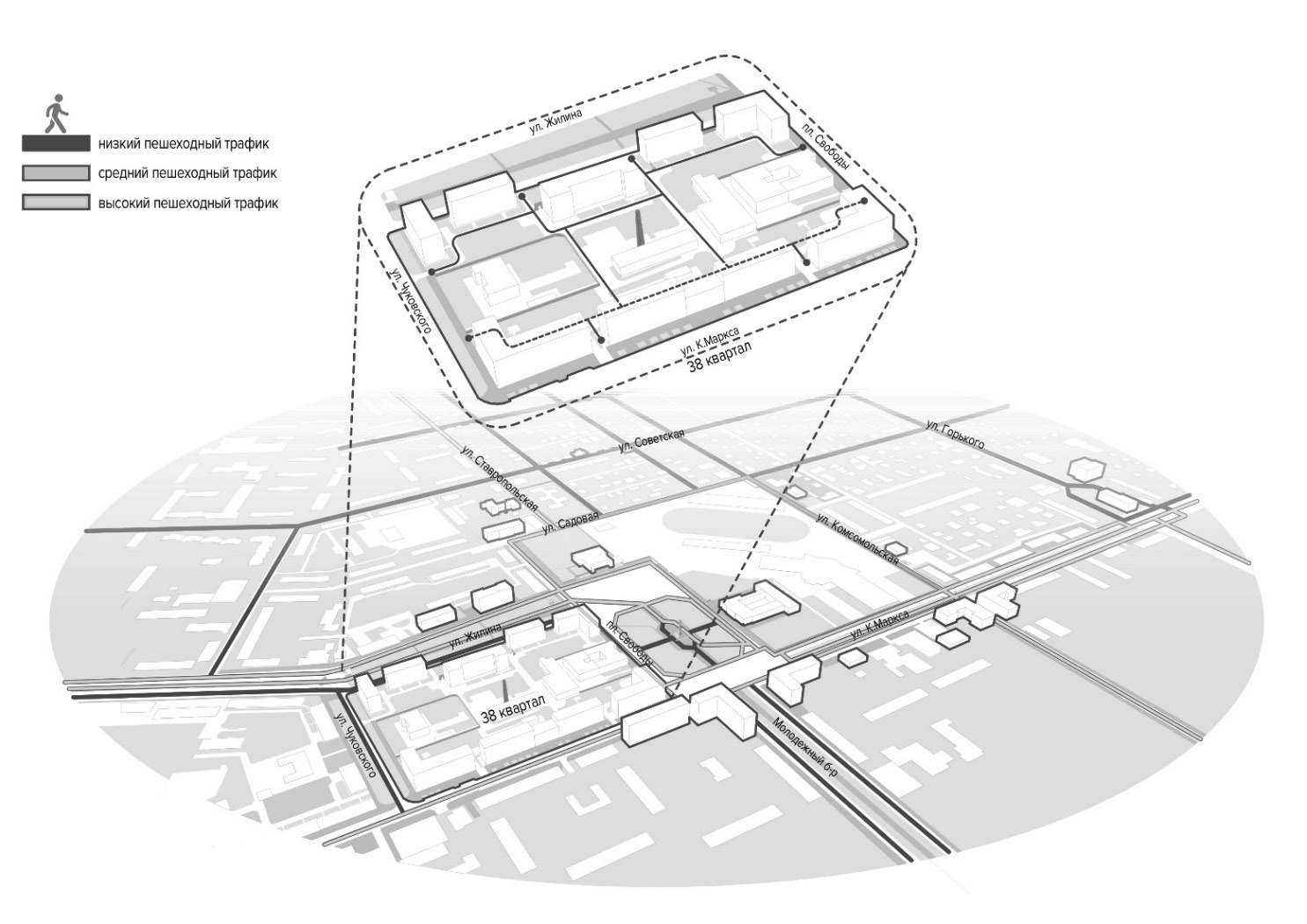 Графоаналитический анализ генплана, сопоставленный с интернет-данными пешеходной и транспортной активности (рис. 1), показал, что от 38 квартала удобно строить пешеходные связи, охватывающие рассредоточенные исторические здания, находящиеся друг от друга в шаговой доступности (рис. 2). Можно выделить ансамбль жилых и общественных зданий площади Свободы, здание народного суда по ул. Карла Маркса, относящееся к памятнику архитектуры в неопалладианском стиле 1955-1959 гг. Далее пересечение ул. Карла Маркса и ул. Горького акцентировано типовым кинотеатром «Буревестник» 1954 г. За ним по ул. Горького можно увидеть здание бывшей общеобразовательной школы. Украшенные декором фасады скрыты пластиковыми панелями. Обратный путь к 38 кварталу может прокладываться через малоэтажный сектор частных домов с немалым количеством примеров деревянного зодчества Ставрополя. Несколько домов музеефицированы и входят в музейный комплекс «Наследие», однако за пределами ограды совершенно отсутствует работа с историческим контекстом. Далее интерес представляет театр Кукол и располагающаяся за ним гостиница «Волна» 1959 г. постройки. Особым интересом и перспективой обладает Баня №1 по ул. Ставропольской. Существуют версии, что стены бани сложены из кирпичей ставропольских зданий кинотеатра, училища и храма, о чем красноречиво говорит фактура кирпичей. Возвращаясь к теме сохранения «памяти места», мы видим в пространстве вокруг бани потенциал организации благоустроенного места, в котором бы отразилась связь с исчезнувшим городом. На рис. 5, п. 6 можно увидеть эскизное предложение инсталляции вдоль стены бани в виде металлических стендов, стилизованных под скатные кровли. Каждый стенд должен оформлять оригинальные или воссозданные наличники Ставрополя.