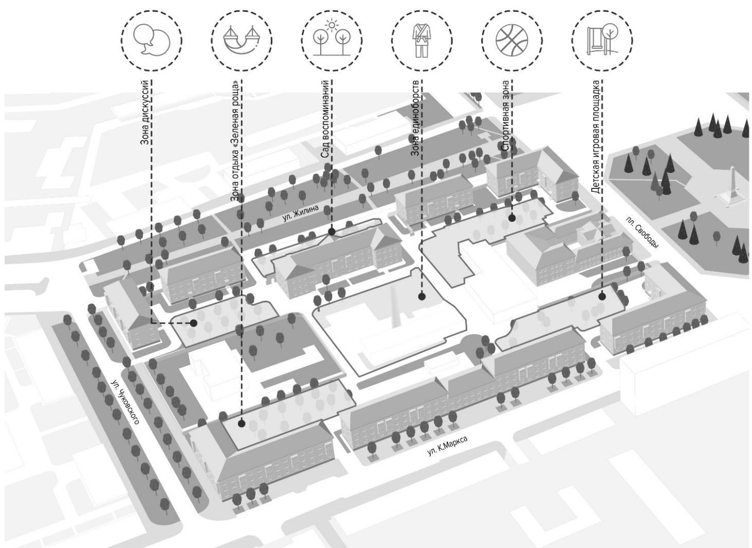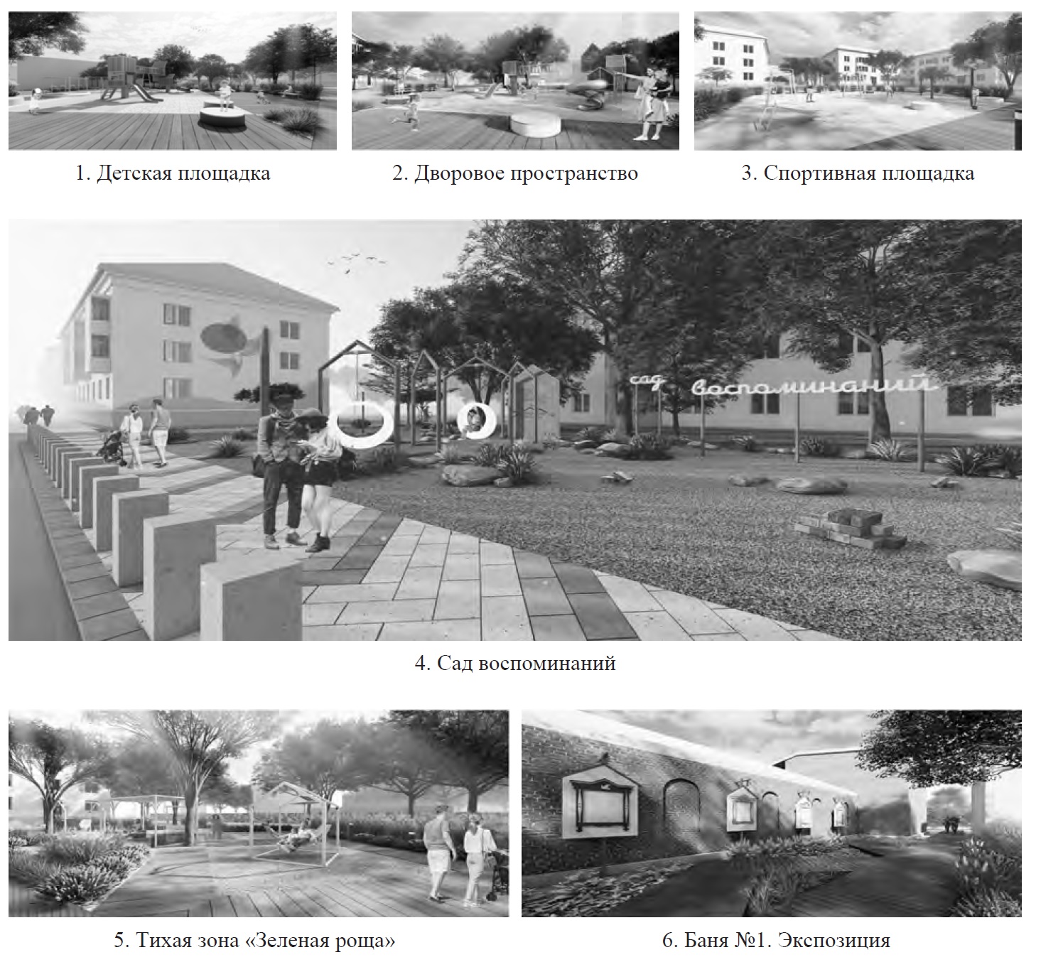 При разработке эскизного проектного решения был применен метод реминисценции, выражающийся отсылкой к историческому образу крестьянского дома с двускатной крышей и декоративными фасадными элементами, переработанными в современные формы. Территорию 38 квартала предлагается разбить на несколько разных по функционалу зон и комплексов (рис. 3, 5): 1) система детских игровых площадок; 2) центральная зона – зона единоборств, трансформирующая комплекс бывшей котельной; 3) спортивная зона; 4) зона отдыха «Зеленая роща».