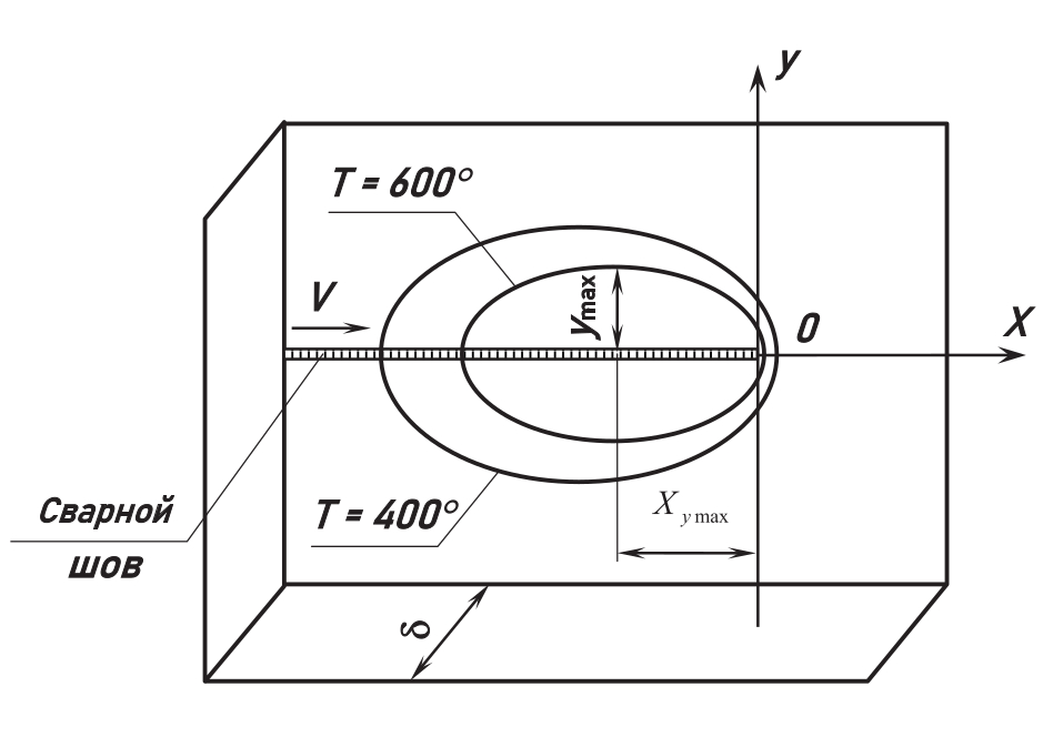 где 2Ymax – искомая максимальная ширина развития «пятна» ослабления, т. е. площади, ограниченной изотермой Т = 600 °С (см. рис. 1).