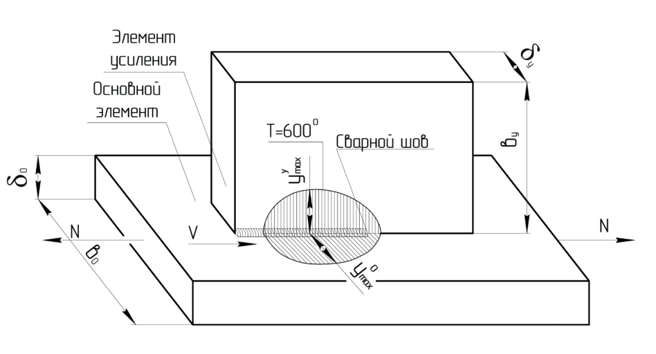 В случае усиления при наплавке связующих сварных швов, тепловая энергия дуги распределяется на основной (усиливаемый) и дополнительный (усиливающий) элементы. При сварке угловых сварных соединений части погонной энергии, вводимой в свариваемые элементы, могут быть определены в зависимости от соотношения толщин. В частности, в случае таврового соединения (рис. 2) погонные энергии, вводимые в основной и усиливающий элементы, могут быть вычислены в соответствии с [9] по формулам: