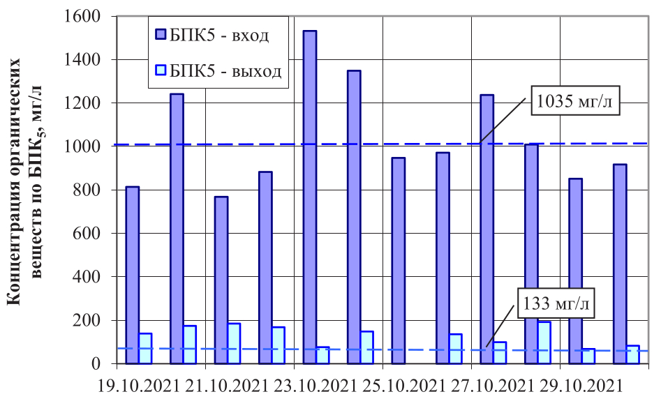 Во втором режиме время пребывания в установке было увеличено до 20 ч. Концентрация жиров в исходных сточных водах изменялась от 268 до 494 мг/л, составляла в среднем 395 мг/л, в очищенных сточных водах – от 4 до 43 мг/л, в среднем – 16 мг/л (рис. 9), эффективность очистки в среднем достигла 96 %. Концентрация органических веществ по БПК5 в исходной сточной воде изменялась от 768 до 1532 мг/л, в среднем − 1035 мг/л, в очищенной сточной воде – от 68 до 192 мг/л, в среднем – 133 мг/л (рис. 10), эффективность очистки составила в среднем 87 %. ХПК исходных сточных вод изменялась от 883 до 4816 мг/л, в среднем − 2278 мг/л, в очищенной сточной воде – от 168 до 489 мг/л, в среднем − 279 мг/л, эффективность очистки в среднем составила 88 %.