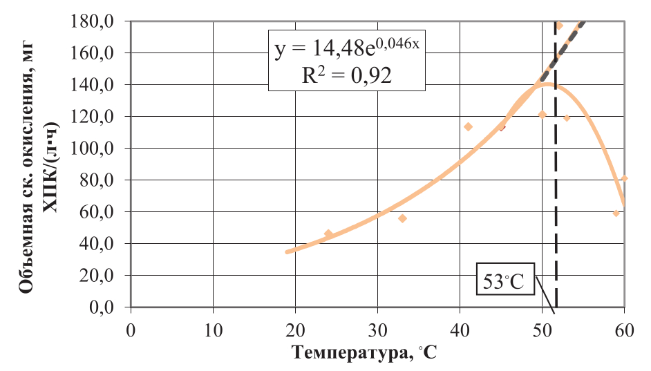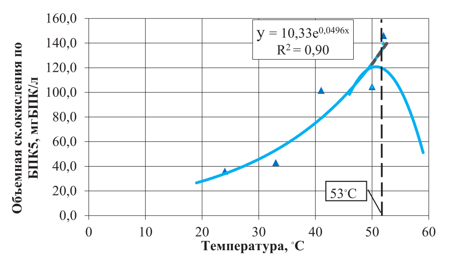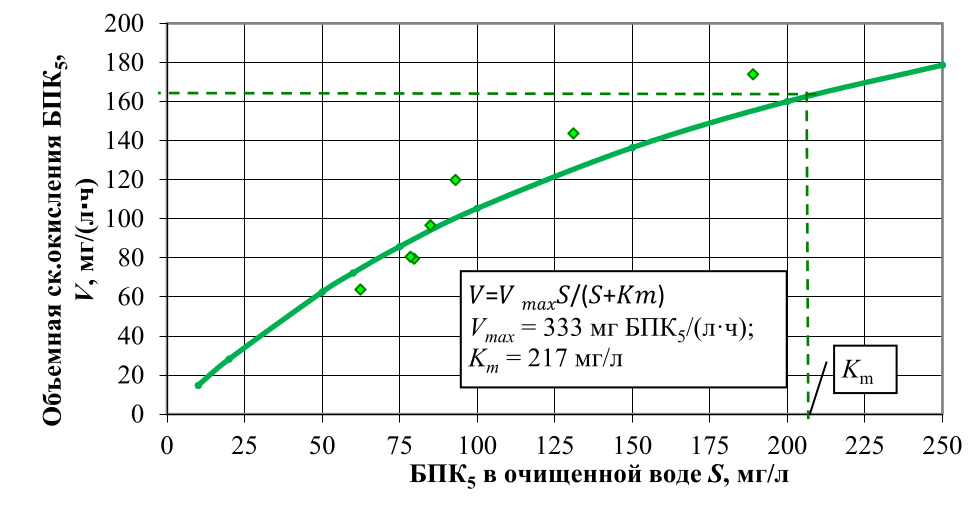 Применив полученные в ходе эксперимента константы, объемная скорость окисления органических веществ V с учетом влияния температуры, при конкретном качестве очистки воды, определяется по формулам: