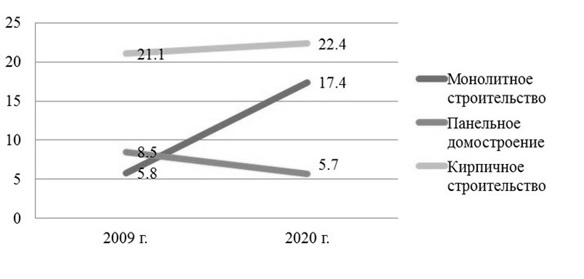По данным исследований за последние пять лет, использование монолитной технологии в строительстве новых жилых комплексов составляет 75-94 %. Кроме того, увеличивается количество коттеджных и дачных поселков, загородных и частных домов. На рис. 1 показан рост монолитного строения с 2009 по 2020 гг. [1].